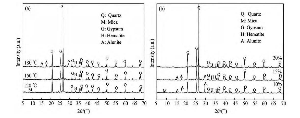 由图5 (a) 可知, 浸出温度小于180℃时, 随着浸出温度的升高, 云母衍射峰不断降低, 钒、铝浸出率不断增加;当浸出温度180℃时, 浸出渣中可检测到明矾石衍射峰, 此时, 铝浸出率降低显著, 表明铝离子水解生成了明矾石是造成高温下铝浸出率下降的原因。相应地, 磷浸出率也开始降低, 这可能是由于部分PO43-取代SO42-进入到明矾石晶格中所致[14]。由图5 (b) 可知, 随着硫酸浓度的增加浸出渣中明矾石、赤铁矿衍射峰不断减弱, 相应地铝、铁浸出率不断升高, 进一步说明硫酸浓度的增加会使得明矾石、赤铁矿溶解度增加, 从而使得铁、铝浸出率增加。