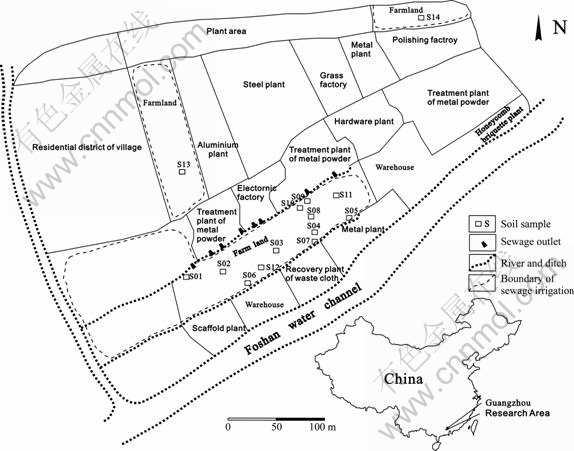The study area is located in the south central Pearl River Delta area and it is surrounded by mountains in the north, west and east, and by the South China Sea in the south. Its total area is about 0.2 km2, and it belongs to the Xibei River alluvial plain where river network is relatively well developed. It is reported that the annual average temperature is in the range of 21.7-22.6 °C and precipitation is in the range of 1 714-1 944 mm in this area. The land-use types of the study area consist of agricultural areas, living area, and industrial zone, of which the industrial area is mainly dominated with metal powder treatment plants (Fig. 1), and the agricultural areas are mainly dominated with flowers and vegetables. Part of industrial waste water is directly discharged into surface water, and the agricultural areas are long-term irrigated by this surface water. The upper stratum of the study area consists of Quaternary alluvial sediments and belongs to marine-terrigenous facies. According to our investigation, it is shown that the media of unsaturated zone in research area are dominated with silty clay and mucky silty clay [13].