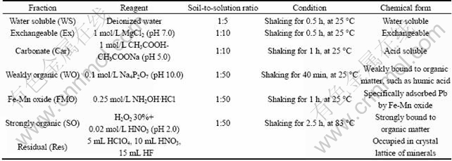 Soil samples were analyzed for the chemical fraction of Pb, pH, organic carbon and Fe2O3. pH was measured at soil-to-water mass ratio of 1:5. Total organic carbon was determined using dichromate oxidation technique [14], and the organic matter (OM) content was calculated by multiplying the total organic carbon content by 1.72 for soil. Fe2O3 was extracted twice by the HCl-HNO3-HClO4-HF method, and the content of Fe2O3 in the extract was determined using a sequential plasma spectrometer. The chemical fraction of Pb in soil samples was extracted by the sequential extraction method described by TESSIER et al [8] with some revisions, and the reagents employed and shaking periods for the extraction of the fractions of Pb in soil are summarized in Table 1. Furthermore, for the determination of total content of Pb, the soil samples were digested in a mixture of HNO3 and HF (9:1) by microwave heating, and the content of extracted Pb was determined by inductively coupled plasma optical emission spectroscopy (ICP-OES) on a Perkin-Elmer 2100DV apparatus. The sum of the seven fractions is 80%-120% of the total content.