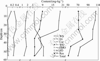 Fig. 4 Total contents and chemical fractions of Pb in soil profile