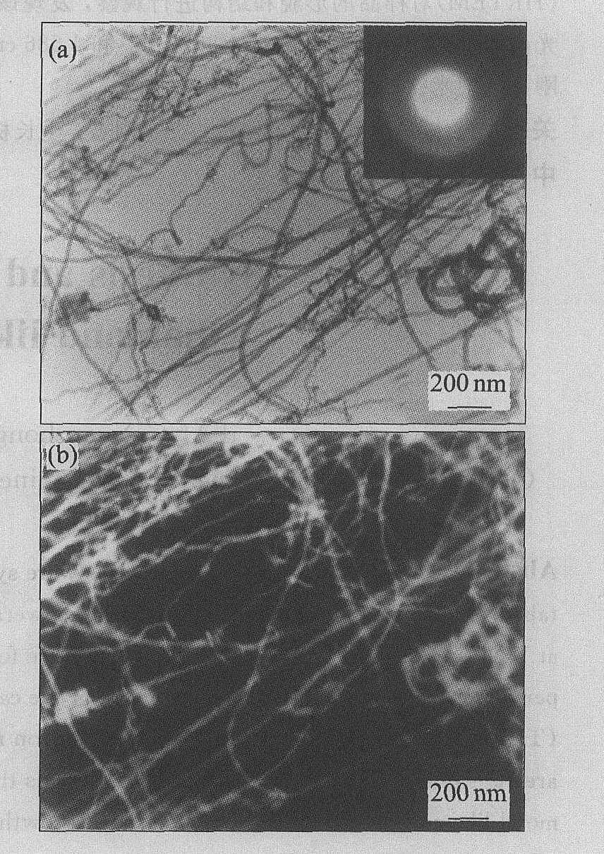 Fig.2 TEM images of carbon nanowires (a)—Bright field image (b)—Dark field image