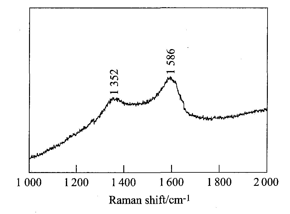 拉曼光谱分析提供了有效的方法证明合成的样品为类金刚石材料。 作者用Renishaw 2000型微拉曼系统研究这种纳米线, 激发源为波长514.5 nm的氩离子激光器, 光斑直径10 μm, 电弧消耗功率为4 mW, 工作温度为室温。 拉曼光谱显示特征峰出现在1 352 cm-1 和1 586 cm-1 处(图5), 这是典型的类金刚石碳材料的拉曼峰