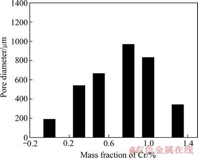 图5所示为Cr含量对GASAR多孔Cu-xCr合金试样平均气孔直径的影响。由图5可看出,试样的平均孔径随Cr含量增加呈先增大后减小的趋势。当Cr含量为0.8%(质量分数)时,达到最大值;超过0.8%Cr(质量分数)后,试样气孔平均孔径开始减小;当Cr含量为1.3%(质量分数)时,气孔平均孔径达到最小值。