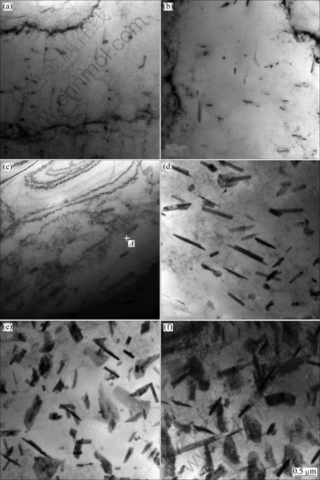 Fig.2 TEM images of samples quenched at different temperatures: (a) 500 ℃; (b) 430 ℃; (c) 410 ℃; (d) 285 ℃; (e) 265 ℃; (f) 50 ℃