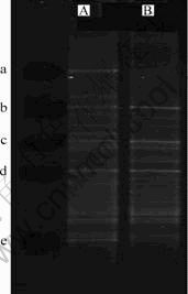 经过富集培养后,样品B中的b,c和d条带存在,而且较亮,但是,a和e条带消失,这说明经过一段时间的富集培养,水体中占优势的微生物种群减少了2种,微生物的多样性呈下降趋势。这说明富集的方式有利于反硝化聚磷菌的生长。