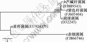 B水样中的代表条带为3条,分别为黄杆菌属、副球菌属、紫色杆菌属。从图2可以看出:7种菌经过富集后减少为4种,这显示SB同步脱氮除磷系统富集后微生物的多样性有所下降。这是因为通过富集运行后,采用反硝化聚磷工艺给聚磷菌提供了厌氧缺氧交替的环境,而且控制污水中COD质量浓度。在厌氧释磷后经过沉淀大大降低污水中COD质量浓度,致使缺氧池进水COD的质量浓度低于50 mg/L,消除残余COD对反硝化聚磷菌的影响,限制了大部分常规反硝化菌的生长,因此减少了污泥中专职的反硝化菌,从而使仅具有反硝化功能的赤细菌属被淘汰,种群多样性随之降低[5],但反硝化聚磷功能的产碱杆菌属、副球菌属仍然存在,充分说明系统的富集方式有利于反硝化聚磷菌的生存。但另一方面是富集后d条带(紫色杆菌属)很亮,反应池中硝酸盐去除率高达90.26%,磷酸盐的去除率高达92.31%,紫色杆菌属的生理生化指标确定其为反硝化菌,而且从图3所示的系统进化树可知产碱杆菌属、副球菌属、紫色杆菌属3种菌属的亲缘关系接近,而黄杆杆菌属和赤细菌属的亲缘关系较远,因此,紫色杆菌属的聚磷功能有待于进一步确定。