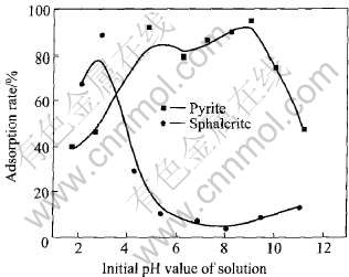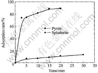 1) 诺卡氏菌在黄铁矿和闪锌矿表面可发生明显的选择性吸附, 在黄铁矿表面的最大吸附率可达到96.99%, 而在闪锌矿表面的吸附率大都在20%以下。