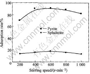 在t=10min、 core=10g/L、 cbal=1.517g/L、 pH=7.14、 θ=16℃的实验条件下, 改变吸附溶液体系的搅拌速度, 考察其对吸附效果的影响, 结果见图7。 可以看出, 搅拌速度在600r/min左右时, 诺卡氏菌在黄铁矿和闪锌矿表面均有一吸附率峰值, 吸附率数值分别为90.97%和17.71%。 在搅拌速度较低时, 诺卡氏菌与矿物之间接触不够充分, 导致吸附率较低; 而搅拌速度过大, 又会使已吸附在矿物表面的菌体脱落, 同样导致吸附率降低。 总体上看, 搅拌速度对吸附效果的影响不大, 在所有实验点上选择性吸附均很明显。