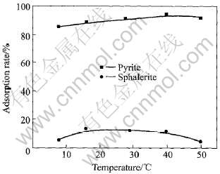 在t=10min、 core=10g/L、 cbal=1.55g/L、 pH=6.50、 v=600r/min的条件下, 改变吸附过程的温度, 考察其对吸附效果的影响, 结果见图8。 可以看出, 随着温度的升高, 诺卡氏菌在黄铁矿表面的吸附率逐渐增加, 但升高的幅度不大; 而在闪锌矿表面上的吸附则是先升高后下降, 但变化幅度也不大。 诺卡氏菌最佳生长温度范围为28~32℃, 诺卡氏菌在此范围内的活性较强, 细胞表面的活性基团可以选择性地快速吸附在黄铁矿表面。 但总体上看, 适当升高温度有利于诺卡氏菌在两种矿物表面上发生选择性吸附。