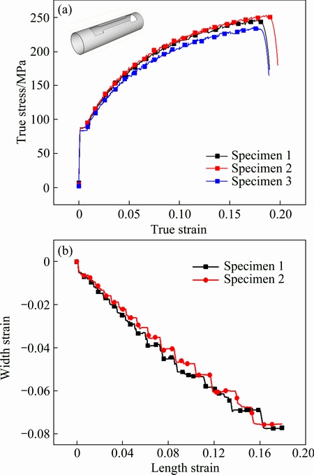 The bending specification is 5052O d50 mm ×1 mm × 75 mm (D × t × Rb, Rb/D=1.5, where Rb is the bending radius; D is the outer diameter of tube). By uniaxial tension tests, the material properties can thus be obtained as shown in Fig. 3. The twist-compression test (TCT) [14] was used to reproduce the friction conditions between tube and bending tools, and the normal anisotropy exponent is calculated by the ratio of the width strain to thickness strain (see Table 1).