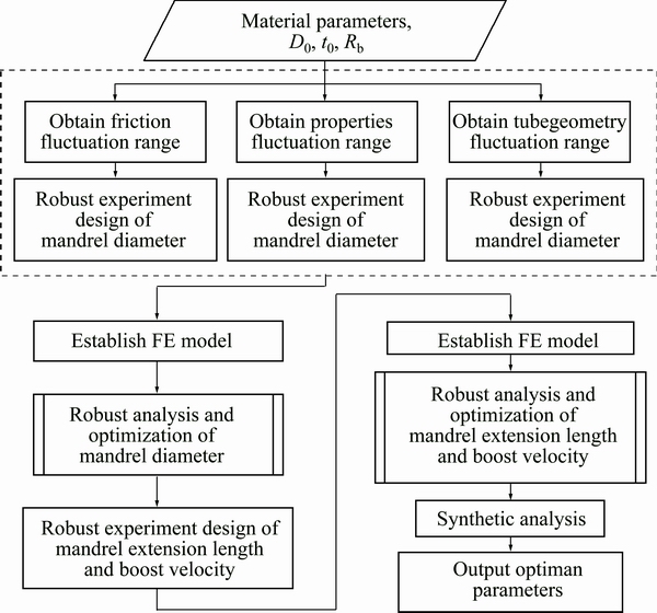 Many studies have been done on different tube bending processes of various tubular materials. However, most studies focus on the effects of forming parameters on individual defect and few on deterministic optimization, saying nothing of robust design considering uncontrollable variables in bending [1-4]. The tooling setup was designed by the fuzzy logic through tube properties and geometry of bending [5]. Using design of experiments (DOE) and FE methods, XU et al [6] conducted the deterministic optimization of mandrel parameters for LDTW Al-alloy tube bending. Considering multiple defects, LI et al [7] developed a knowledge-based substep method to solve the multi- objective deterministic optimization of LDTW Al-alloy tube bending. However, whether the optimal results by the deterministic design work robustly in mandrel bending of Al-alloy tube is questionable. Robust optimization has become a promising and important technology in product design [8,9]. BAGCHI [8] discussed the Pareto-optimal robust design for solving the multi-objective design problems by genetic algorithms (GA). Using multi-objective particle swarm optimization method, SUN et al [9] presented a multi- objective robust Pareto design to consider the roles of uncertainties on draw bead optimization, in which the variations were obtained by the six sigma principle and the surrogate model was formulated by a dual response surface method (RSM). These studies provide the method references for robust design of LDTW Al-alloy tube bending.