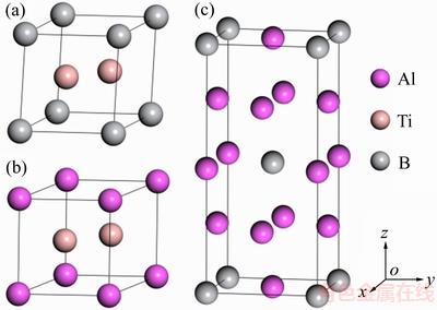 到目前为止,不少研究者[8-10]试图解释制备过程中氟盐在铝熔体中的反应机制及情况,以改良Al-Ti-B的制备工艺,从而进一步开发Al-Ti-B的细化潜能。然而,K2TiF6、KBF4与Al的反应生成TiB2、TiAl3等中间相的过程受化学反应机制、元素扩散等众多因素影响,难以精确分析熔体中氟盐反应机理。本文作者采用基于密度泛函理论(Density functional theory,DFT)[11-12]的第一性原理方法,研究AlB2、TiB2和TiAl3的结构稳定性以及电子特性,并结合准简谐德拜模型对这3种物相在高温条件下的热力学基本性质进行分析,期望从原子角度揭示3种物相在Al-Ti-B体系下的基本性质,为开发新型高品质Al-Ti-B制备工艺提供理论支撑。