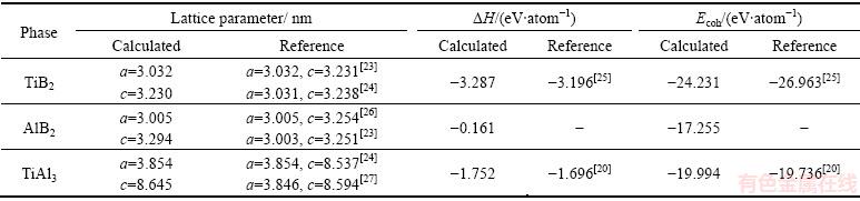 表1 计算所得TiB2、AlB2以及TiAl3的晶体结构参数、形成热与结合能以及实验值