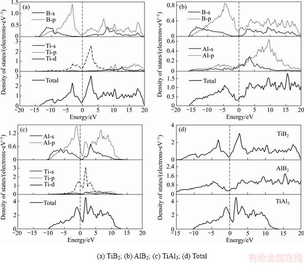 为了解TiB2、AlB2和TiAl3的成键特性,并进一步揭示出3种物相的结构稳定性差别,本研究中分别计算了3种物相的总态密度(Total density of state, DOS)和分态密度(Partial density of state, PDOS),结果如图2所示,图中虚线表示费米能级(Fermi level)。