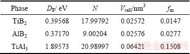 式中:DF为费米能级处态密度值;nm、ne分别为晶胞内热激活电子、价电子的密度,而ne可由晶胞体积(Vcell)与总价电子数(N)计算得到:ne=N/Vcell。相关参数以及计算结果如表3所示。由表3可以看到,TiAl3的fm相对较大,其次是AlB2,而TiB2的金属性最小。