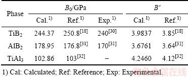 表4 TiB2、AlB2和TiAl3的体弹模量B0以及其对压强的一阶导数B'