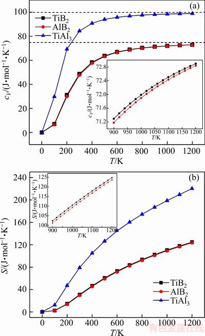 图3(b)显示出零压条件下TiB2、AlB2与TiAl3的熵S随温度的变化情况。可以看出在100~500 K温度范围内,TiAl3的熵值随温度的升高而剧烈增大。当温度继续上升时,熵增速率放缓(可以预计当温度高于某个值后,熵会逐渐趋于一个极限值);而TiB2和AlB2的熵值增大速率低于TiAl3,且当T>200 K后,熵增速率比较恒定。从900~1200 K高温区内变化情况来看,TiB2的熵值大于AlB2,且两种硼化物的熵值与温度基本呈线性增加的关系。900 K时,TiB2、AlB2和TiAl3的熵分别为102.367、101.191和187.088 J/(mol·K)。