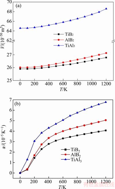 不同温度下计算所得TiB2、AlB2和TiAl3的热平衡体积V与热膨胀系数