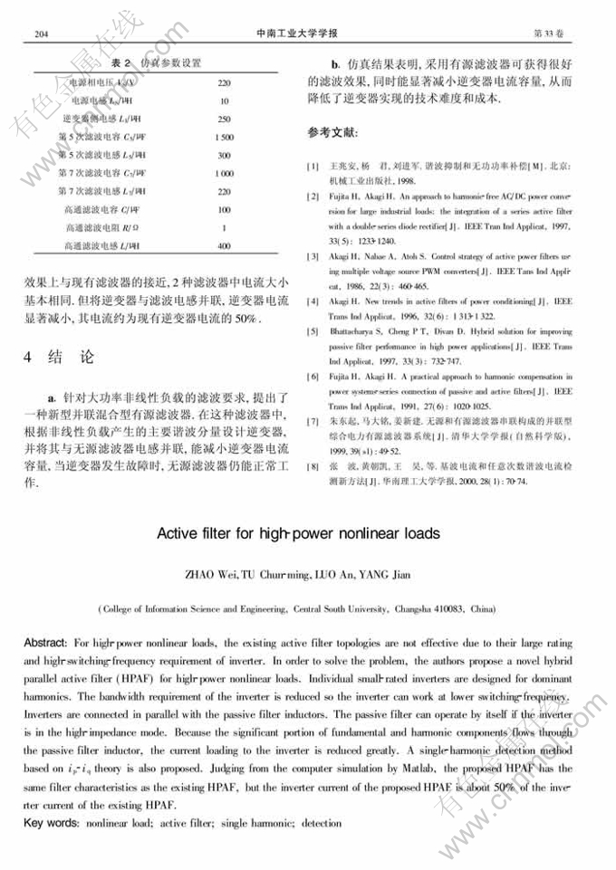 摘 要:采用现有有源滤波器对大功率非线性负载进行谐波滤除时,要求逆变器同时具有很大的容量和较高的开关频率,这必然增加逆变器的技术难度和成本,限制了有源滤波器在大功率场合的应用.作者针对这一问题提出一种新型并联混合型有源滤波器,根据非线性负载产生的主要谐波分量设计逆变器以减小逆变器电流容量,同时逆变器输出电压频率较低,逆变器开关频率可相应降低.逆变器与无源滤波器电感并联,当逆变器发生故障时,无源滤波器仍能正常工作.由于并联滤波电感的分流作用,逆变器电流减小.此外,还提出一种以ip-iq法为基础的单次谐波电流检测方法.Matlab仿真结果表明,并联混合型有源滤波器滤波效果与现有并联混合型有源滤波器的滤波效果接近,但其中逆变器电流减少50%.