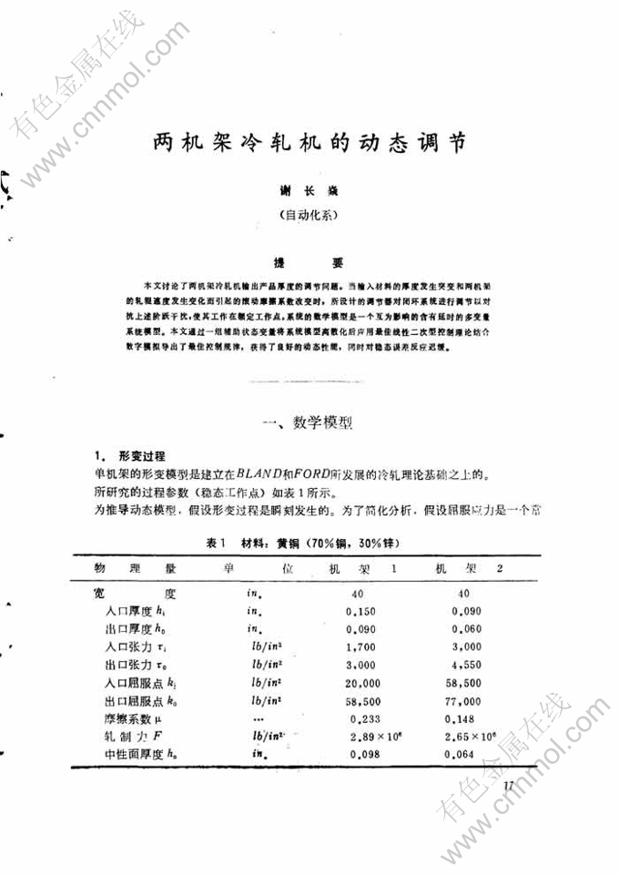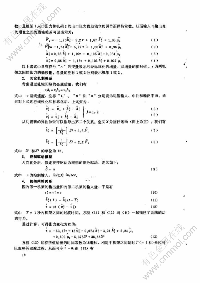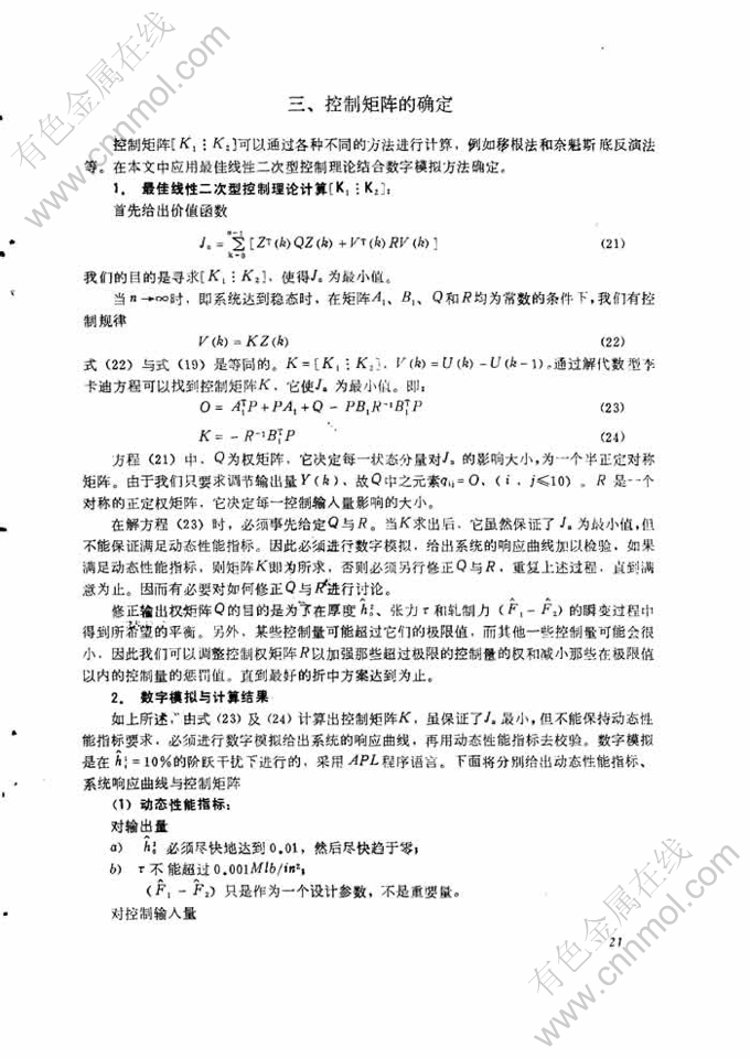关键词:冷轧机; 数字模拟; 线性二次型控制; 动态调节; 系统模型; 机架; 状态变量; 数学模型; 控制规律; 动态性能指标