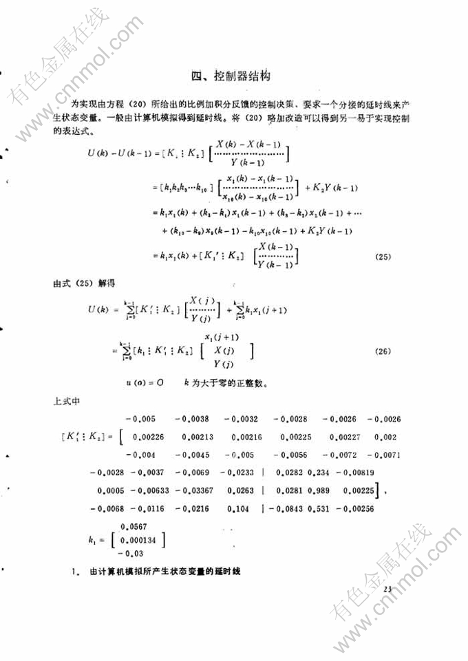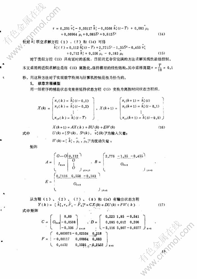 摘 要:本文讨论了两机架冷轧机输出产品厚度的调节问题。当输入材料的厚度发生突变和两机架的轧辊速度发生变化而引起的滚动摩擦系数改变时,所设计的调节器对闭环系统进行调节以对抗上述阶跃干扰,使其工作在额定工作点。系统的数学模型是一个互为影响的含有延时的多变量系统模型。本文通过一组辅助状态变量将系统模型离散化后应用最佳线性二次型控制理论结合数字模拟导出了最佳控制规律,获得了良好的动态性能,同时对稳态误差反应迟缓。