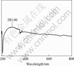 如图5所示,贮存1 a后的纳米Ag粉在用超声波震荡后,在283 nm处出现较强的吸收峰即Ag颗粒表面等离子体共振吸收峰,它起源于激光电磁场诱导的电子相干共振[5]。此吸收峰的位置、形状和颗粒的大小、形状、分散状态相关,吸收峰的位置随粒的增大而向长波移动[6-7]。但Sun等[8]报道吸收峰的位置出现蓝移现象,本实验属于这种情况,其原因可能是经超声波震动后,大颗粒被分散成各种大小不等的微粒,静止后,较大的微粒下沉,留下极少量的较小微粒在溶液中。正如Sun等[8]指出的,这也可能是微粒表面(银氧化物)与分散介质之间的相互作用而引起的。这种现象值得在实验及理论上进行进一步探讨。
