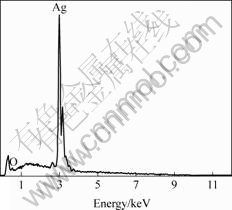 图6所示为在未密封的广口瓶中贮存1 a后的纳米Ag粉的X射线能量色散谱(EDAX)。结果表明:其中含有1.04%(质量分数,%)的O。而XRD图谱分析没有发现氧化物的生成,这说明XRD图谱分析的精确度有限,并且纳米Ag粉的氧化并不十分严重。其原因是纳米Ag粉在钝化时,表面生成致密的氧化层阻止了纳米Ag粉被空气继续氧化。