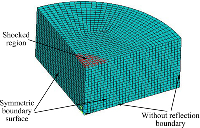 在有限元模拟中冲击应力波会在模型边界处发生反射,反射波汇聚到中心会对结果造成一定影响,因此,为了防止应力波反射所造成的影响,需要使用半无限大三维实体模型,即在模型的侧面和底面施加无反射边界条件,让应力波透射。模拟时,为了与实验结果有更好的对比,所使用的模型尺寸与实验所用的试件完全一致,即直径为15 mm、高为5 mm的圆柱体,在圆柱体正中心冲击,由于冲击压力与模型均关于中心对称,为提高计算效率,仅建立1/4模型进行分析计算,并在对称面上施加对称边界条件。最终的有限元模型如图4所示。