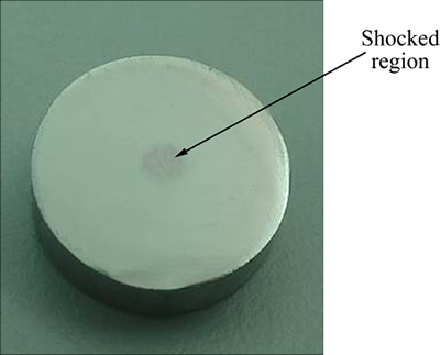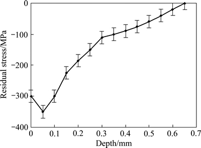 实验时所用的试件照片如图5所示,材料为TiAl合金,名义成分为Ti-45.5Al-2Cr-2Nb-0.15B。在由中科院沈阳自动化研究所搭建的型号为SIA-LSP-1的激光冲击强化设备上进行,所用的高能脉冲激光器型号为Extra-20,脉冲能量为9 J,激光波长为1064 nm,脉宽为20 ns,采用直径为3 mm圆形脉冲在中心冲击一次。在激光冲击之前,先将试件在 HY4050型豪克能应力消除设备(频率为40 kHz,输出振幅为50 μm)上处理5 min,以消除表面残余应力,再用酒精清洗并用氮气吹干,然后,在试件表面粘贴一层100um厚的黑胶带作为吸收层,并用厚度为2 mm的流动水膜作为约束层。然后,在试件中心进行单次激光冲击,冲击之后使用Proto-LXRD型X射线应力测试仪测量激光冲击区域表层与深度方向的残余应力,测量方法采用倾斜固定ψ法,其衍射条件列于表1,深度方向残余应力采用0.5 mol/L的 Na2SO4+H2SO4溶液进行逐层电解腐蚀测量,X射线辐照区域直径2 mm,即测量的是激光冲击区域中心2 mm内的平均应力[19]。由于模型与冲击压力的对称性,x方向与y方向残余压力基本相等,分布规律也一致,因此,以下讨论中均使用y方向的残余应力进行表示。测量结果如图6所示,数据误差为±20 MPa,从图6可以看出,残余压应力最大值出现在次表层,最大值为-350 MPa,之后,随着深度的增加,残余压应力逐渐降低,在0.65 mm左右减小为0。