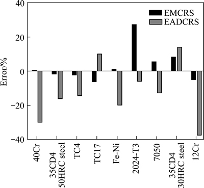 图7所示为从文献[12-13, 20-23]中得到的不同材料激光冲击强化实验结果与模拟结果对比的误差,其中残余压应力最大值误差(Error of the maximum compressive residual stress,EMCRS),残余压应力影响深度误差(Error of affected depth of compressive residual stress,EADCRS)的负值表示模拟值比实验值小,正值表示比实验值大。从图7可以看出,残余压应力最大值与实验值之间的误差主要集中在±10%之内,并且正负分布比较均匀,因此,本文作者将残余压应力最大值误差范围设定为±10%。残余压应力深度误差变化范围比较大,从为-37.5%~14%,但误差仍集中在-20%~14%之间,因此,将残余压应力影响深度误差范围设定为-20%~14%。