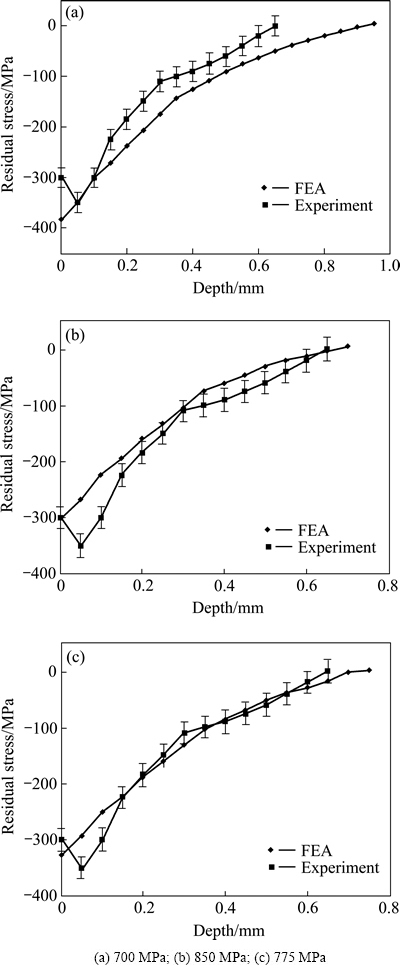 改变材料的动态屈服强度为850 MPa,再次进行模拟,其结果如图9(b)所示,残余压应力最大值为-300 MPa,影响深度为0.68 mm,与实验值的误差分别为-14.2%和4.6%,残余压应力最大值超出误差范围,并且压应力在深度方向上均比实验值小,且大部分数据都落在实验数据的误差范围之外,说明所选的动态屈服强度大于实际值,使塑性变形比实际值要小,造成残余压应力减小。