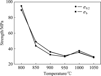 1) 随着温度的升高,工业纯钛TA1的屈服强度和抗拉强度呈下降趋势,在800~900 ℃范围内急剧下降,伸长率增大,在800~950 ℃范围内,伸长率提高了近50%。