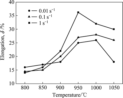 Fig. 4 Relationship between elongation and temperature of pure commercially titanium TA1 at different strain rates