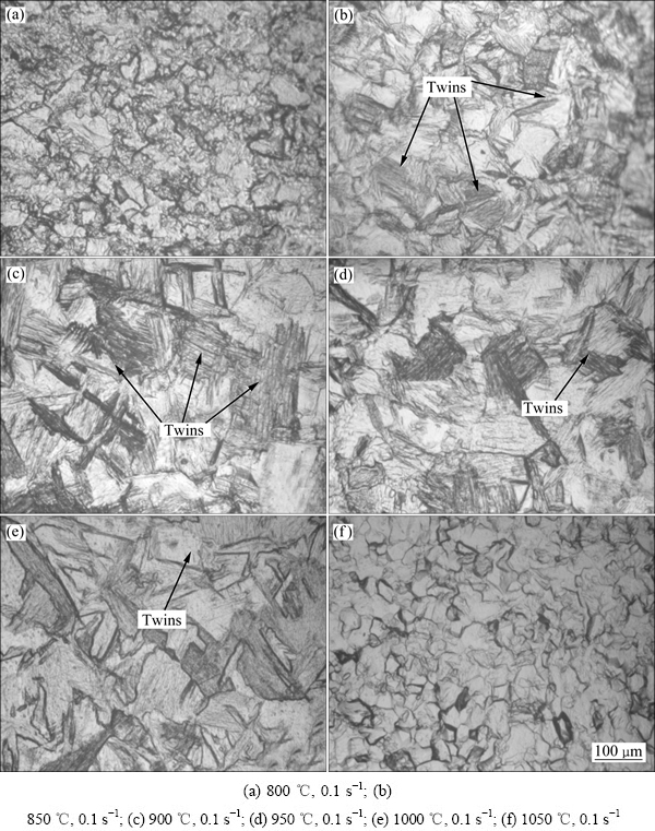 图4所示为不同应变速率下工业纯钛TA1拉伸试样断后伸长率与温度的关系。由图4可知,在不同应变速率下,随温度升高,伸长率先升高后降低。温度的升高导致孪晶出现,使得材料软化,晶格的取向产生变化,因而使得原来处于不利取向的滑移系得以启动,从而降低了位错滑移的阻力,也就是说孪晶对材料的变形有软化作用。但是,已有研究表明:孪晶的密度会随着温度的升高而降低[24, 30-32]。本实验中对不同温度变形条件下孪晶数量的变化进行了观察表明,800 ℃下出现少量孪晶(见图5(a)),850 ℃下孪晶数量增多(见图5(b)),900 ℃下孪晶数量进一步增多,并伴随着孪晶的长大(见图5(c))。当温度继续升高到950 ℃时,孪晶数量逐渐减少(见图5(d));当温度为1000 ℃时,孪晶数量进一步减少(见图5(e));随温度进一步升高至1050 ℃,孪晶数量急剧减少,晶粒变小(见图5(f))。显然,图5(a)~(f)中孪晶数量的变化与文献[31-32]所述随温度升高孪晶密度减少是一致的。孪晶密度减小,位错运动阻力增大,导致在高温下伸长率有所减小。所以,孪晶对工业纯钛TA1变形的影响实际上存在双重效应,即随温度升高,孪晶的出现导致局部取向变化,使得材料发生软化,塑性流动变大,从而引起伸长率的增大;另一方面,随温度升高,孪晶数量减少,滑移阻力增加,塑性流动减小,材料伸长率减小。两者的共同作用使得材料伸长率随温度的变化先增大后减小(见图4)。
