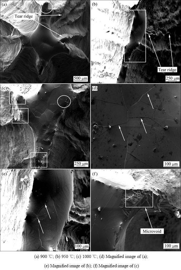 随温度继续升高到1050 ℃时,试样拉伸断口形貌如图9(a)所示,可以看到纤维区内断口表面粗糙形状不规则,呈明显的颗粒状,并伴随高温氧化作用,可看到断口出现熔化聚集成滴的现象。局部放大图如图9(b)所示,可以看到拉伸断口呈结晶状,由解理小断面和大量高密度短而弯曲的撕裂棱组成,有明显细小的再结晶等轴晶粒,并伴有少量的韧窝和互相连接的小空洞。断裂沿着晶粒的晶面进行,断口晶粒明显,立体感强,呈现这种形貌是因为高温下晶界上的原子扩散比晶内原子剧烈,晶界强度明显低于晶内强度,晶界成为高温断裂的策源地,因而发生准解理断裂。解理断裂一般来说是脆性断裂,但这并不等同于脆性断裂,有时解理断裂也可伴随有很大的延性。该温度状态下的拉伸断裂伸长率为30%,如图4所示。此外,从图9(a)中可以看出,放射区内存在有大量的放射花样,由于裂纹在此时的快速不稳定扩展以及伴随着较大的塑性变形,放射区和剪切唇区域连成一片,剪切变形占据了主要地位,这种情况下材料的塑性较好。放射花样形态呈现出放射剪切状,如图9(a)中箭头所示有大量的剪切脊存在,说明该状态下的断裂还是伴有很大延性。