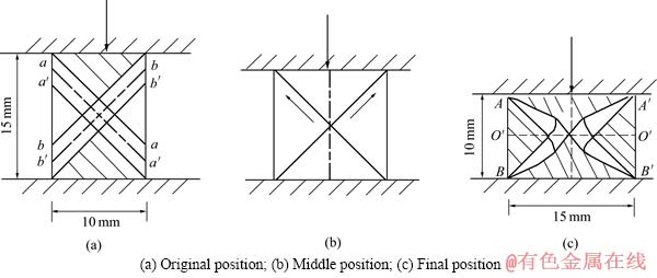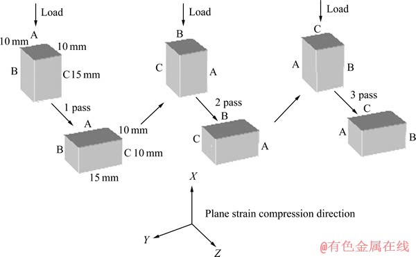 实验所用的材料是Al-4Cu(质量分数,%)合金,首先加工成10 mm×10 mm×15 mm长方体试样。于540 ℃盐浴炉中固溶3 h后水淬,随后采用190 ℃、16 h的时效工艺,获得充分析出长大的θ″析出相。采用自行设计内腔尺寸为10 mm×10 mm×15 mm的挤压模,按应变轴X→Y→Z→X进行换方向压缩,如图1所示。每道次挤压产生的等效应变ε为0.4。试样分别在室温(RT)、50、60、70和100 ℃下进行多道次加工,每道次加工后进行中间退火处理(在加工温度下保温10 min),采用MOS2润滑剂减小挤压过程中的摩擦阻力,最终将试样加工至欲断裂状态。