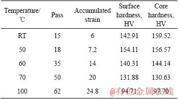 MAC加工温度低于50 ℃基本不影响试样的最大累积应变量;60 ℃是提高累积应变量的温度转变点,随后加工道次随加工温度的进一步提高而提高。分析不同加工温度下试样表面与心部硬度差值的变化:室温加工态试样的表面和心部硬度相差约17 HV;在50 ℃以上进行加工,试样表面和心部硬度相差都很小,约4 HV。分析比较不同加工状态试样的心部硬度:由于50 ℃对最大累积应变量的影响很小,因此,50 ℃和室温加工的硬度变化不大;60 ℃加工态较室温态几乎降低15 HV;随着温度进一步提高,硬度继续下降,试样在100 ℃加工62道次后,硬度出现剧变,接近未变形时效态的(99.7 HV)。