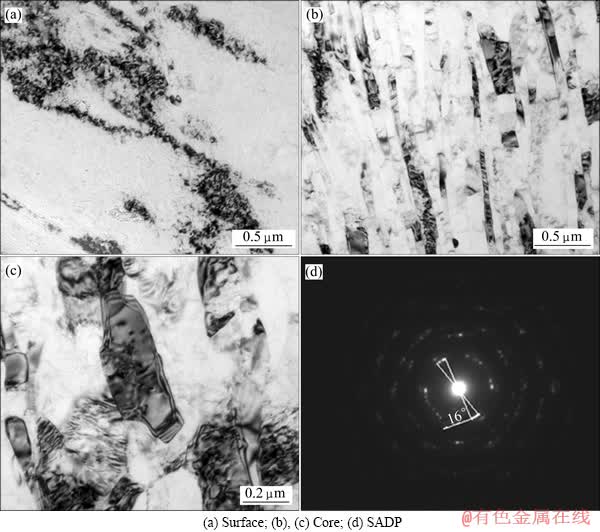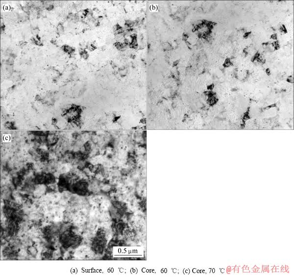相比室温加工的组织,试样经60 ℃加工35道次和70 ℃加工50道次后的组织观察(如图3所示的低倍TEM照片)表明,随着变形温度和加工道次的提高,表面和心部组织趋于均匀(如图3(a)和(b)所示),在硬度检测上体现为表面和心部硬度相差很小,约4 HV(见表1);拉长晶粒基本转变为等轴晶;并且有颗粒状第二相在晶界和位错密度高的地方再析出。