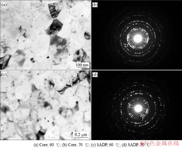 Fig. 4 High magnification TEM images and SADP patterns of samples after MAC deformation by 35 passes at 60 ℃ and 50 passes at 70 ℃