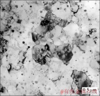 图5所示为试样经100 ℃加工62道次后的TEM像。与60 ℃加工态相比晶粒明显粗化,约0.5 μm;再析出第二相进一步粗化、量化。这些组织特征导致硬度出现迅速降低,接近未变形时效态见硬度测试结果。