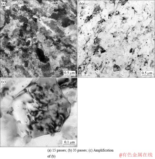 LANGDON[3]认为强变形获得的超细晶是不同剪切带交叉相遇后发生反应造成晶粒组织破碎的结果,并定义带宽δ为晶粒细化的极限。HARREN等[15]研究平面应变压缩过程中剪切带的形成,表明剪切带是由许多均匀分布剪切层组成,层的宽度在0.1 μm左右。这些研究结果能很好地解释本实验中的现象:MAC加工15道次后,形成了许多平行的带状组织,如图1(b),带宽在0.1 μm左右;而60 ℃时加工晶粒细化的极限也为0.1 μm。这对LANGDON[3]定义带宽δ为晶粒细化的极限也做出了有力的证实。