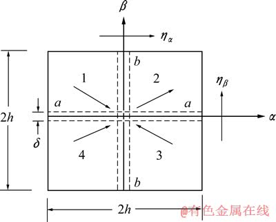 材料加工过程随着应变量的增加可分为两个不同阶段。在低于某一应变值下,进行稳定连续流变(这一临界应变值根据加工状态而定,在1.0~4.0范围内变化[13]),对应组织结构的演变可用位错反应机制来解释,见文献[14]。在中等应变量时,随着剪切带的形成,局部集中流变取代稳定塑性流变。图7所示为SEGAL建立的微观局部流变模型。剪切带a-a和b-b的形成将材料元分割成4个小单元。滑移系在剪切带内激活,并终止于剪切带与基体边缘。因此,塑性变形主要集中在剪切带内,而其他4个区域则做刚性平动。