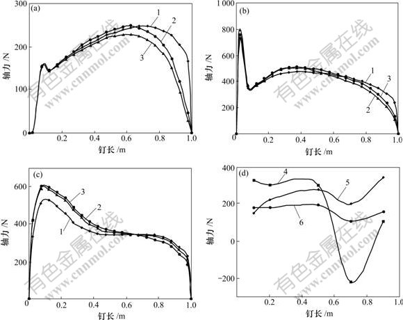 (a) 1号土钉,数值计算结果;(b) 2号土钉,数值计算结果;(c) 3号土钉,数值计算结果;(d) 模型实验结果