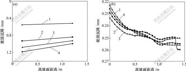 b. 在坡面附近,坡顶沉降有一定的动载累积效应,但随着离坡面距离的增大,这种效应很不明显。需指出的是,坡顶沉降出现凹槽效应。