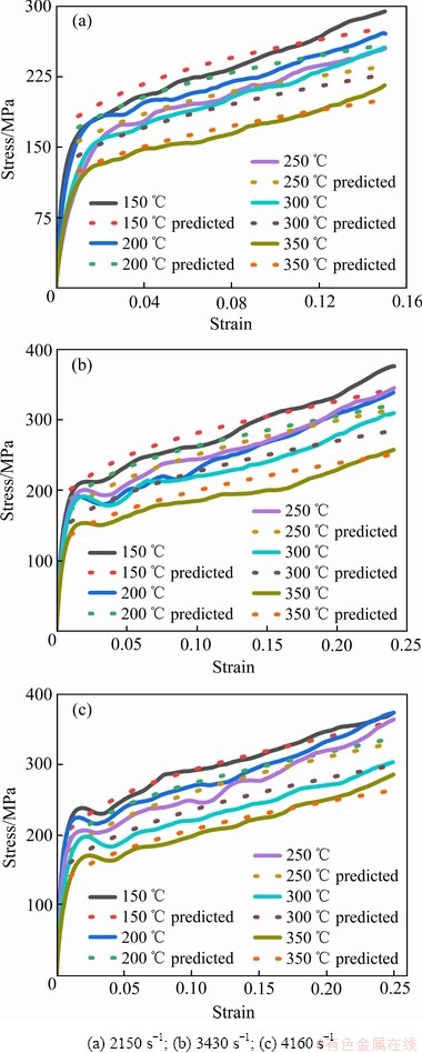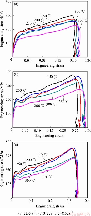 材料的强度不仅与晶粒尺寸减少引起的强化有关,而且研究表明孪晶的存在也具有强化作用[16, 24]。ZHANG等[16]发现拉伸孪晶提高了AZ31镁合金板材的屈服强度。XIN等[18]研究发现AZ31镁合金中拉伸孪晶有效地增强了合金的屈服强度和抗拉强度。在本实验中应变速率为2150 s-1、温度为250 ℃时微观组织为孪晶,此时孪晶强化占主导地位,而温度升高到300 ℃时微观组织以再结晶晶粒为主,细晶强化作用弥补了由于温度升高带来的软化作用,同时孪晶数量急剧减低,细晶强化作用大于孪晶强化。因此,孪晶强化、细晶强化和温升软化相互竞争作用,导致图2(a)中当温度从250 ℃升高到300 ℃时,流变应力下降幅度不明显。同样,在应变速率为3430 s-1、温度为200 ℃和250 ℃时,组织从以孪晶为主转变为以再结晶为主。由于组织转变导致的孪晶强化和细晶强化、以及温升软化三者共同作用,最终导致图2(b)中200 ℃和250 ℃时的流变应力下降幅度不明显。同样的现象也发生在应变速率为4160 s-1、温度为150 ℃、200 ℃和250 ℃时。可见,孪生、再结晶等微结构的形成会影响动态力学行为。