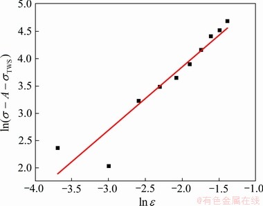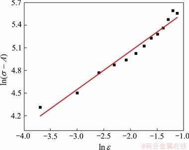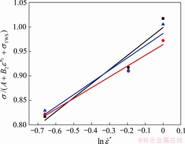 拟合线的斜率可以确定n1、n2,根据其截距可以确定B1、B2。拟合的数据是从参考应变速率和参考温度的应力应变曲线上均匀选取,其拟合结果如图4和5所示。由此可以确定n1为0.509,n2为1.159,B1为434.971 MPa,B2为476.492 MPa。