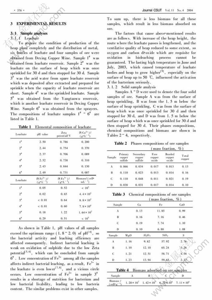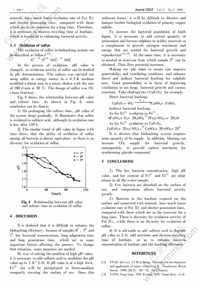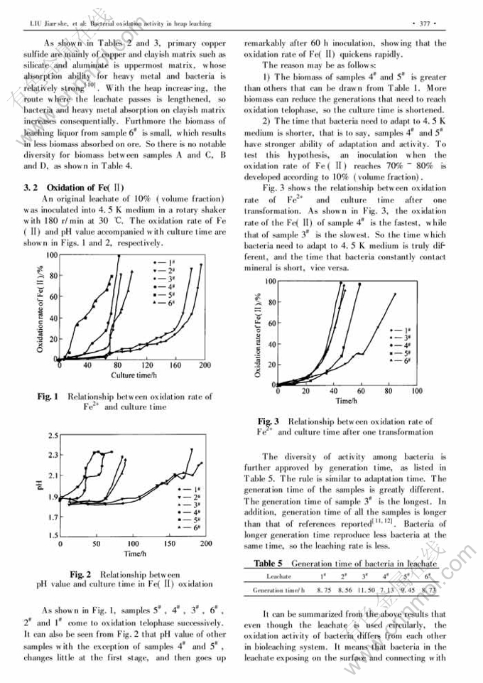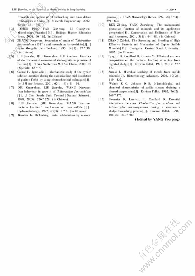 Abstract: Bioleaching of sulfide minerals by bacteria, mainlyThiobacillus ferrooxidans ( T. f.)andThiobacillus thiooxidans,plays an important role in hydrometallurgy because of its economic and environmental attractions. The surveys of production process and the bacterial oxidation activity in the heap bioleaching were investigated. The results show that pH value is high, bacteria biomass and ferric concentration are low, generation time (above 7.13 h) is long in leachate, and less bacteria are adsorbed on the ores. The bacteria in the leachate exposing on the surface and connecting with mineral, have much faster oxidation rate of Fe(Ⅱ) and shorter generation time, compared with those which are in the reservoir for a long time. There is diversity for oxidation activity of Fe(Ⅱ), while there is no diversity for oxidation of sulfur. So it is advisable to add sulfuric acid to degrade pH value to 2.0, add nutrients and shorten recycling time of leachate, so as to enhance bacteria concentration of leachate and the leaching efficiency.