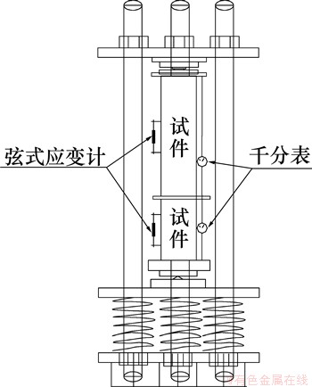 在混凝土配合比中,水胶比为0.3,膨胀剂掺量(质量分数)分别为4%,8%和12%;钢管直径为88,140和219 mm;长度分别为350和500 mm;壁厚分别为1.3,2.0和3.0 mm。配合比、钢管型号及应力比见表3。试件标准养护28 d后,采用弹簧式三杆徐变仪加载,钢管混凝土同时受力,施加的长期荷载为235.3 kN。将钢管换算成混凝土计算钢管混凝土的力学特性,确定混凝土的应力比分别为0.15,0.31,0.33,0.37和0.74(在分析其机理时,本文考虑钢管对混凝土的套箍作用,将钢管混凝土按照组合结构进行受力特性计算)。采用千分表和弦式应变计测量钢管混凝土的徐变变形,试验温度为 (20±1) ℃。试验加载、测点布置及试验过程见图1。