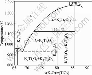 Fig.1 shows the phase diagram of K2O/TiO2 [13]. From the phase diagram, the precursor K2Ti4O9 whiskers will appear at temperatures above 926 °C, when the molar ratios of K2O to TiO2 is 65%-80% [14]. Moreover, at 710 °C, the K2CO3 will decompose into hydrosoluble non-crystal K2O, which will volatilize at even higher temperatures. And this would lead to the mismatched molar ratio of K2O to TiO2. Therefore, the precursor K2Ti4O9 whiskers were prepared through the solid-state reaction at 950 °C for 24 h with different molar ratios of K2O to TiO2 in the air.
