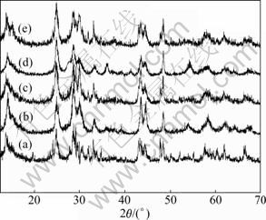 Fig.3 XRD patterns of TiO2-B prepared for different times from K2Ti4O9: (a) 6 h; (b) 12 h; (c) 24 h; (d) 36 h; (e) 48 h